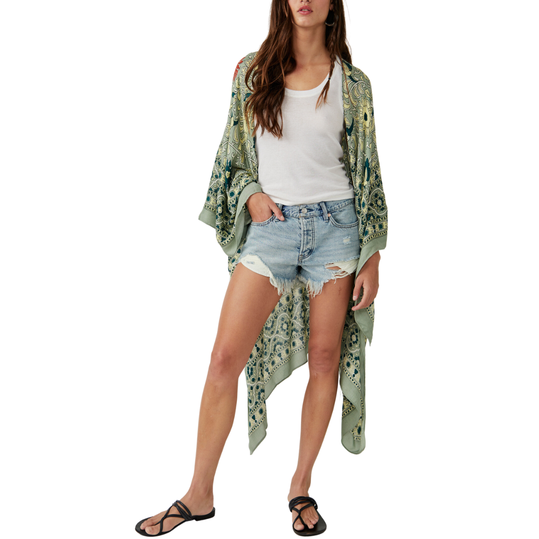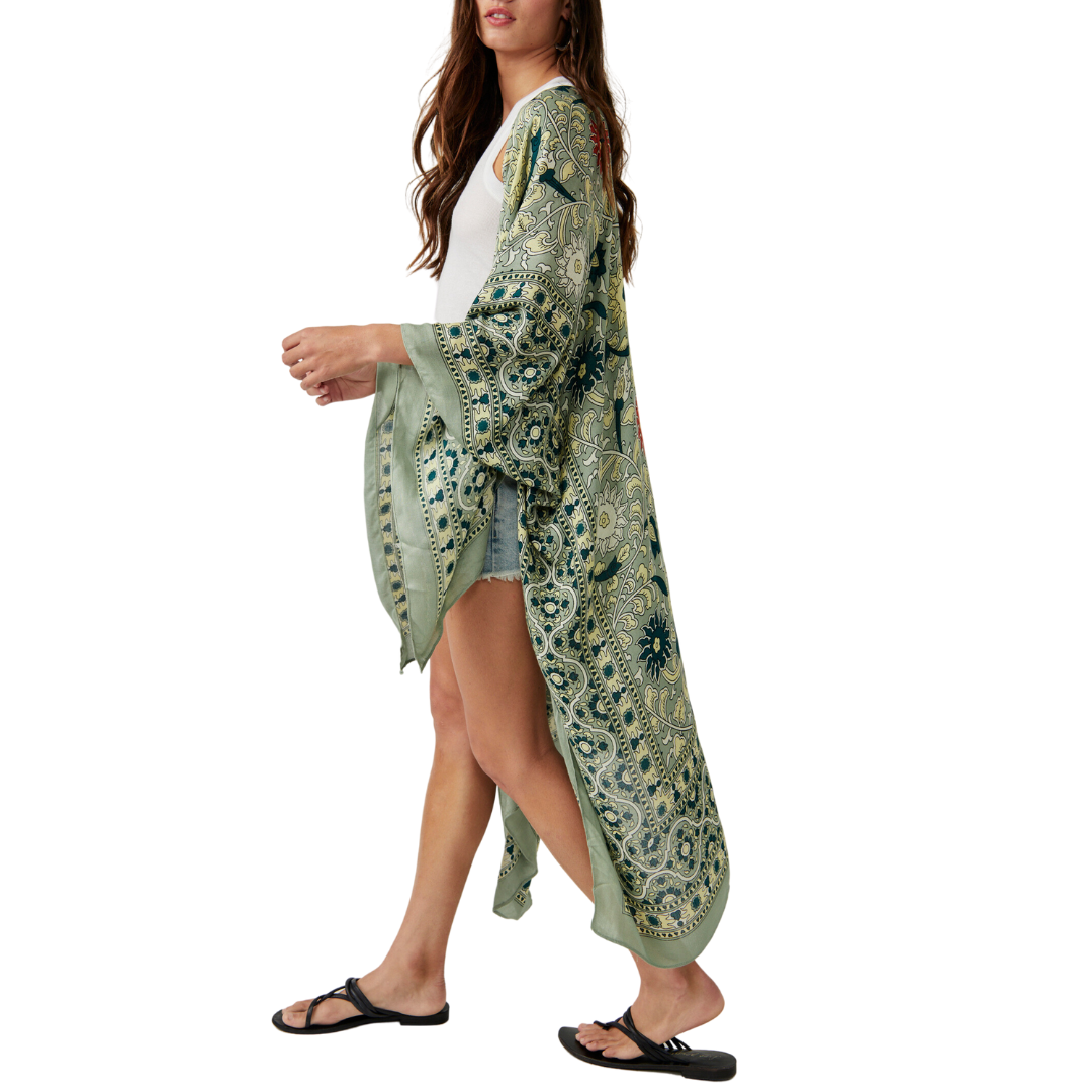 The Magic Dance Kimono is lightweight and features a colorful pattern with a border print. Make a statement with this bold style.